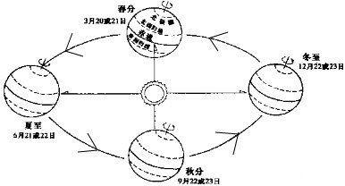 解答:地球的公转产生了四季的变化.当3月21日左右时,阳光直射在赤道上,此时为春分日.从今天起,太阳光的直射点继续向北运动,当6月22日前后,太阳光的直射点到达北回归线,此时为夏至日.从这一天开始,太阳光的直射点转向南运动,当9月23日前后,太阳光的直射点又回到赤道,此时是秋分日.太阳光的直射点继续向南运动,当12月22日前后,太阳光的直射点到达南回归线,此时是冬至日.