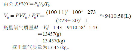 25、问答题 一个氧气瓶,容积为100L,在温度为20℃时,瓶上压力表指示的压力为100个标准大气压,求瓶里氧气的质量?(标准状况下,每升氧气的质量是1.43g)