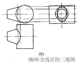 分析图(a)所示的三视图,根据机件形状补全三视图相贯线。