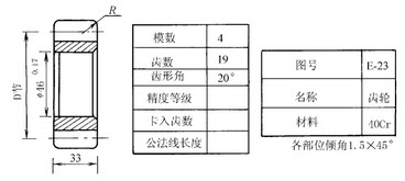8、问答题 绘图题:已知正齿轮模数m=4,齿数Z=19,齿形角α=20°,齿宽B=33,孔径46+0.17,画出齿轮零件图。
