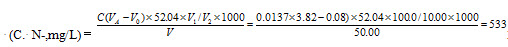 用硝酸滴定法测定水中氰化物,已知样品中氰化物含量高,取50.00ml水样,加入150ml蒸馏水蒸馏,接收馏出液100ml,取10.00ml滴定,测定数据如下:滴定空白溶液A.gA.NO3溶液0.08ml,滴定水样消耗A.gNO3溶液3.82ml,A.gNO3溶液浓度为0.0137mol/L,试计水样中氰化物的含量。