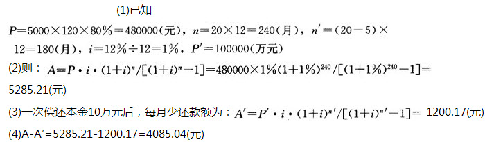 30、问答题 某家庭以八成按揭、年利率为6%,期限20年的按月等额还本付息的贷款方式购买一套建筑面积120平方米的住房,住房价格为5000元,5年后一次偿还本金10万元,问:5年后每月的还款额是多少元?
