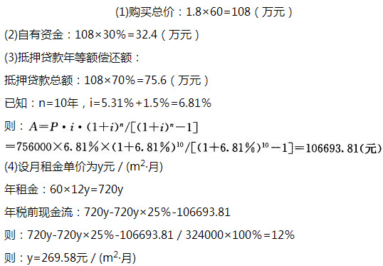 11、问答题 某投资者以1.8万元/m2的价格购买了一个建筑面积为60m2的店铺,用于出租经营。该投资者以自有资金支付了总价款的30%,其余用银行提供的抵押贷款支付。该抵押贷款期限为10年,年利率为5.31%基础上上浮1.5个百分点,按年等额偿还。经营费用为毛租金收入的25%。投资者希望该店铺投资在抵押贷款还贷期内的税前现金回报率不低于12%。试计算在还贷期内满足投来源:91 考试网资者最低现金回报率要求的月租金单价(每1m2建筑面积月毛租金)。