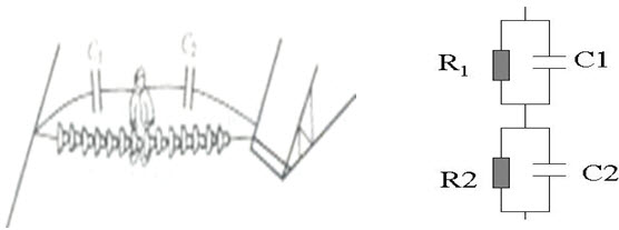 14、问答题 识绘题:试画出人沿耐张串进入强电场时的等值电路图已知,R1、R2为绝缘子串两部分绝缘电阻C1、C2为人体对带电体和接地体电容,画出等值电路图。
