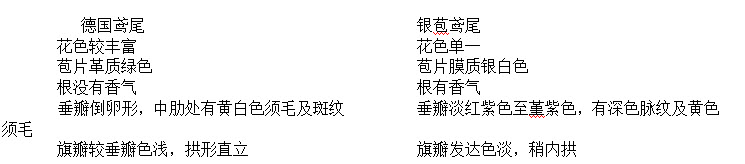 19、问答题 简述德国鸢尾与银苞鸢尾的形态区别。