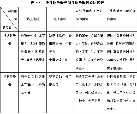 铸铁散热器与钢铁散热器性能比较见表4.2