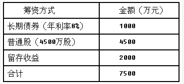 某公司目前的资本来源包括每股面值1元的普通股800万股和平均利率为10%的3000万元债务。该公司现在拟投产一个新产品,该项目需要投资4000万元,预期投产后每年可增加息前税前利润400万元。该项目备选的筹资方案有三个: