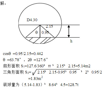 18、问答题  某厂水泥磨球面到磨机中心的高度h=0.95m,磨机有效长度为8.64m,有效内径为4.30m。钢球平均堆积密度为4.5t/m3,作图计算求该磨的实际装球量为多少?