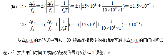 20、问答题  用某计数式频率计测频率,已知晶振频率的相对误差为Δfc/fc=±5×10-8,门控时间T=1s,求:  (1)测量fx=10MHz时的相对误差;  (2)测量fx=10kHz时的相对误差;并提出减小测量误差的方法。