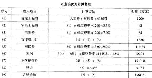 3.由于本案例中43%>40%,即C>C0,则应采用以人工费、材料费、机械费合计(即直接费)为计算基础计算工程造价,计算结果详见下表(保留到小数点后三位)。
