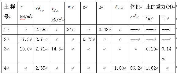 105、问答题 已知某地基土试样有关数据如下:①天然重度r=18.4kN/m3,干密度rd=13.2kN/m3;②液限试验,取湿土14.5kg,烘干后质量为10.3kg;③搓条试验,取湿土条5.2kg,烘干后质量为4.1kg,求(1)土的天然含水率,塑性指数和液性指数;(2)土的名称和状态。