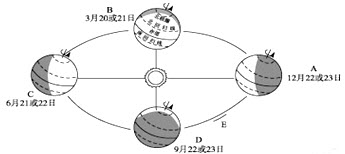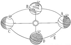 (1)请在E处短线上补画箭头,表示地球公转方向.