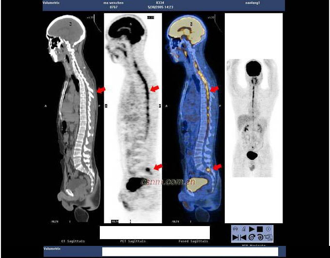 男,32岁,确诊左颞叶胶质母细胞瘤Ⅳ级,手术切除病灶,术后放疗2个月,化疗3个疗程;现距放疗结束17个月。查体:右上肢轻度乏力,骶尾部及双足麻木,排便困难;检查:MRI示左颞叶肿瘤局部复发可能。行PET/CT显像全身检查如图。最可能的诊断()。