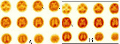 女,72岁,突发头痛,意识丧失24h入院,行99Tcm-HMPAO脑断层显像如图,7天后复查如图,正确的诊断是()。