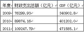 计算题:根据下表中数据,计算2011年我国财政支出对GDP的贡献率为多少(保留2位小数)?