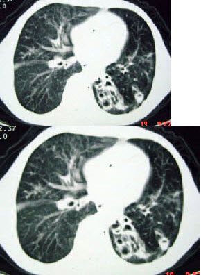 男,32岁,咳嗽,咳脓痰伴发热、胸痛一月余,抗感染治疗不见好转,PPD(-),结合CT图像,最可能的诊断是()