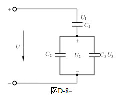 107、问答题 图D-8为三只电容器混联的电路图,已知:U=600V,C=12μF,C2=6μF,C3=30μF,试求等值电容C为多大?总电量Q和能量W为多大?各分电压U1,U2,U3为多大?