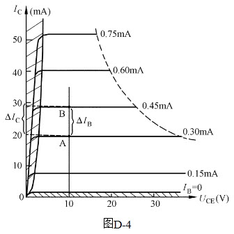 202、问答题  计算题:利用图D-4中某晶体三极管输出特性曲线簇,计算UCE=10V时,(1)该三极管在B点处的hEF值;(2)由A和B两点有关数值,计算该三极管的β值。