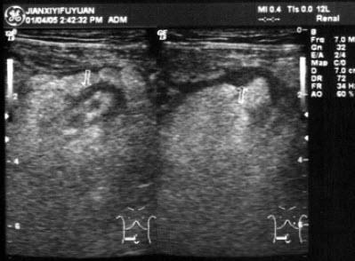 ③淋巴结呈椭圆形,有完整强回声包膜,皮质呈均匀低回声,髓质回声稍强