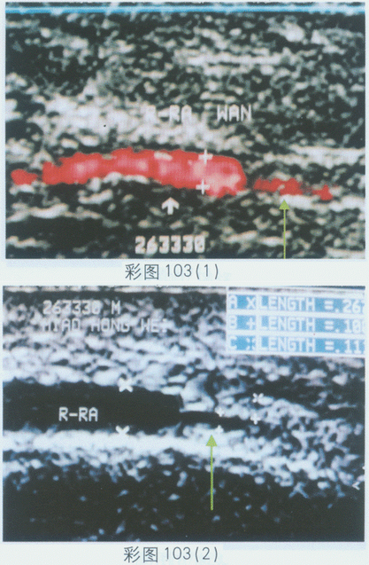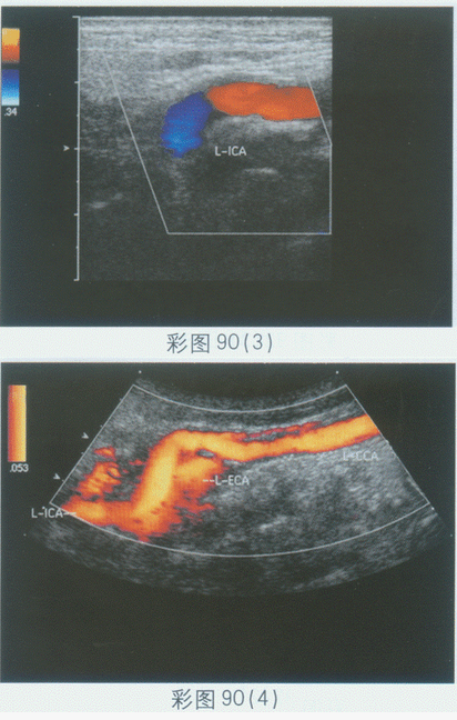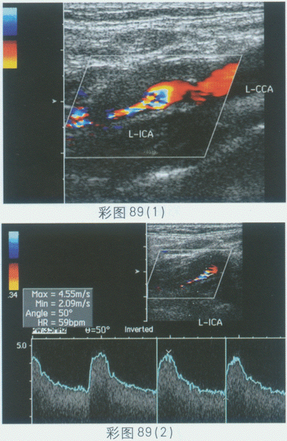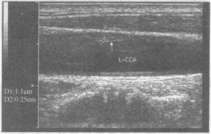 临床资料:男,78岁,自述头晕1月余,体位变化站立时明显。超声综合描述:双侧颈总、颈内动脉内膜粗糙,连续性差,中内膜增厚,管壁可见多个大小不等强回声光团,最大1.1cm×0.3cm,位于右颈总动脉分叉处,后伴声影,该段残余管腔内径0.36cm。