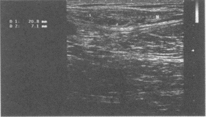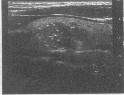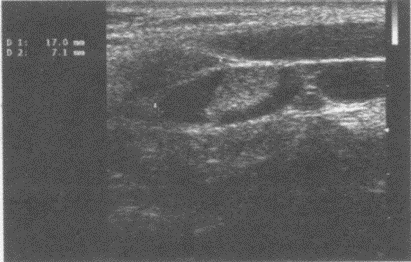 临床资料:男,25岁,自述发热,嗓子痛。临床物理检查:扁桃体红、肿大,体温39.0℃。超声综合描述:双侧颈部血管旁可见数个两头稍尖长圆形低回声,最大1.7cm×0.7cm,边界清晰,长径/短径比值(L/S)≥2。