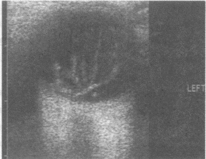 B.左腹股沟区多发不均质回声区(反应性淋巴结肿大)
