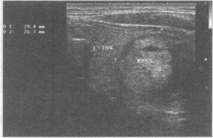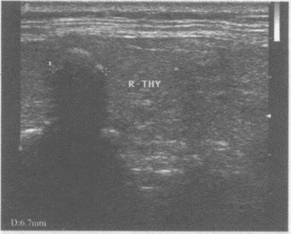 患者,女,25岁,颈部触及肿块半年余,无明显不适。甲状腺超声见右侧甲状腺一单发异常光团,如图。最可能的诊断为()。