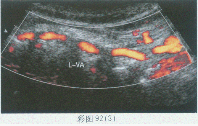C.左腹股沟区多发低回声、不均质回声(淋巴结转移瘤)