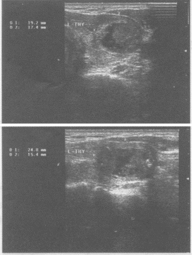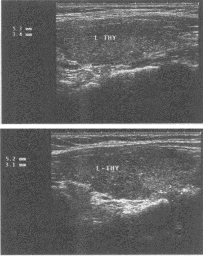 临床资料:男,49岁,常规体检。超声综合描述:甲状腺左叶上、下极后方可见大小均为0.5cm×0.3cm中等回声,边界清晰,形态规则,内回声均匀。