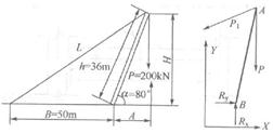 计算题:如下图所示:一独脚桅杆起重机,它的长度为36m,桅杆与地面夹角α为80°。试求:(1)桅杆的垂直高度H和水平距离A及缆风绳长度L;(2)缆风绳受力;(3)支座受力及桅杆承受的轴向压力。(sin80°=0.985;cos80°=0.174)