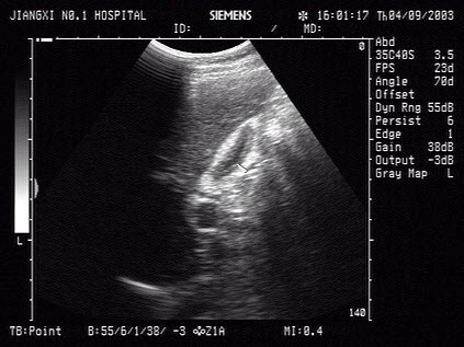 一患者,发热,右上腹痛,血常规检查白细胞增多。结合超声声像图,诊断为()