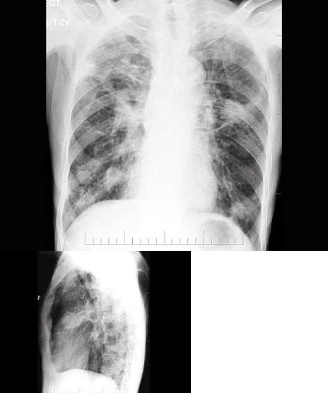 男,70岁,胸痛,不咳嗽、发热,X线检查如图,最可能的诊断是()