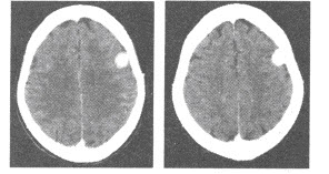7、单项选择题 男,30岁,头颅外伤5小时,CT轴位平扫示左额骨骨折,头皮血肿,额顶部双凸形不均匀高密度,中线结构右移,最可能的诊断为()
