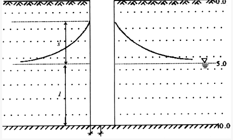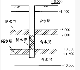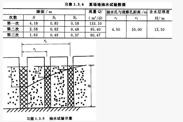 某建筑场地进行多孔抽水试验,底层情况、滤水管位置和孔位如习图1-3.5所示,有两个观测孔,测试主要数据见习表1.3.4。