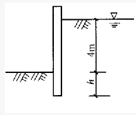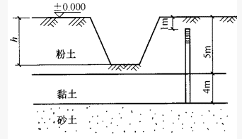 如图所示为某建筑基坑,第一层为粉土5m,第二层为黏土4m,两层土的天然重度均为18.5kN/m3,其下为强透水砂层,地下水为承压水,贮存于砂层中,承压水头低于地面1.0m。试问:基坑不发生基坑底隆起(即突涌现象)时,最大临界开挖深度h(m)最接近下列()项()