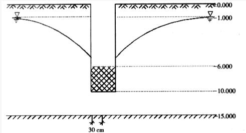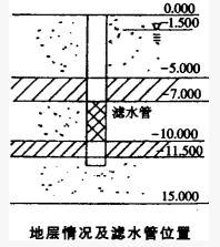 某建筑场地进行单孔抽水试验,地层结构(见下图)为:0~15m中砂土,15m以下为泥岩,地下水埋深为1.0m抽水井深度为10m,过滤器长度4.0m,安置在抽水井底部,抽水井直径为60cm,第一次降深为1.5m,稳定涌水量为191m3/d;第二次降深为3.0m,稳定涌水量为451.3m3/d;第三次降深为4.5m,稳定涌水量为781m3/d,则该砂土层的渗透系数为()m/d。()