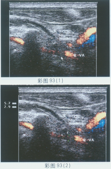 临床资料:女,28岁,右颌下肿、不适两月余。超声综合描述:右侧颌下腺可见1.5cm×1.1cm长圆形低回声,边界清晰,形态规则,内回声不均,后方声加强,CDFI:其内及周边可见血流信号。见下图及彩图82。