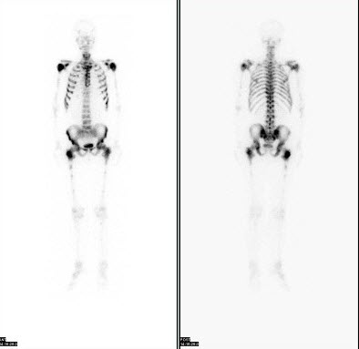 男,71岁,右胫骨骨巨细胞瘤术后4年,无明显不适,行Tc-MDP骨显像如图,对此正确的描述()