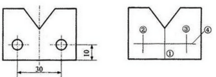 要在金属零件上钻两个孔(如左图所示)。确定圆心位置的划线流程(如右图所示)最合理的是()