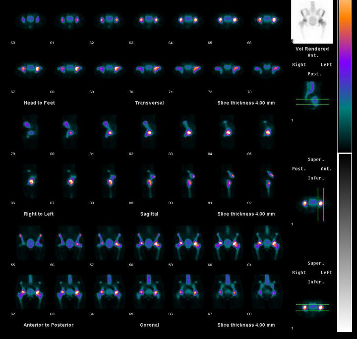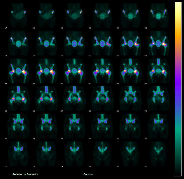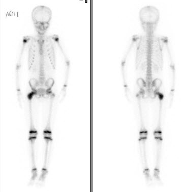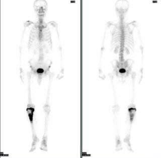 男,10岁,1年前有摔跤史,未予重视,近期出现右下肢疼痛,行Tc-MDP全身骨显像及髋关节断层显像如图,最可能的诊断是()