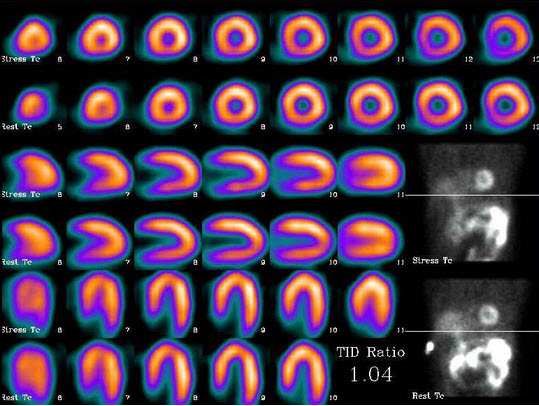 一男性病人的99Tcm-MIBI运动-静息心肌灌注显像如图,可能的诊断是()
