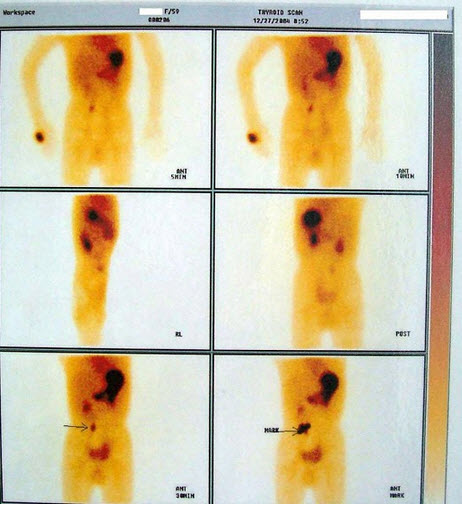4、单项选择题 功能自主性甲状腺瘤(Plummer病)和先天性一侧甲状腺缺如依靠下列哪种手段可以区分()