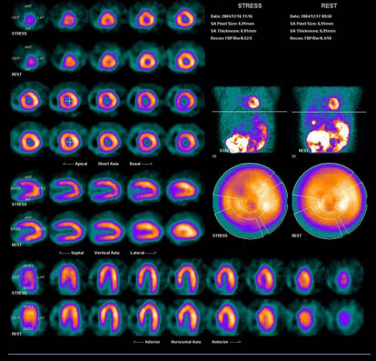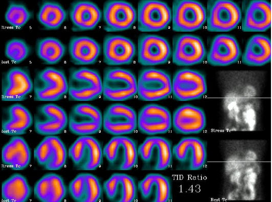 女,54岁,左胸前阵发性压榨性痛4月余就诊,Holter正常,行99Tcm-MIBI运动-静息心肌灌注显像如图,最可能的诊断为()