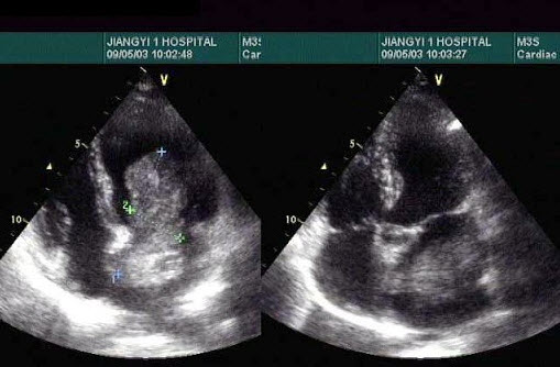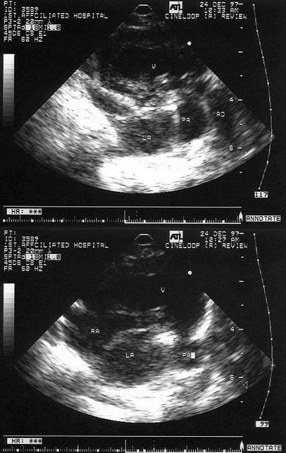 293、单项选择题 左侧三房心的超声所见,哪一项错误()