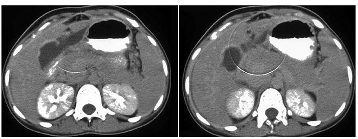 患者,男,50岁,右上腹痛伴黄疸,超声体检发现腹腔多个液性暗区。CT图像如下,最可能的诊断是()