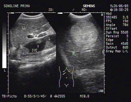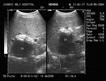 17、单项选择题 患者于肝右前叶下段与左内叶交界处发现低回声不均匀实性肿块,边缘欠清,其内见多个强回声团伴声影,胆囊腔内无回声区消失,最可能诊断为()