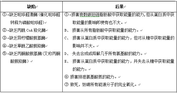 下列两栏中,左栏是遗传代谢缺陷,涉及单个分解代谢酶的丢失,右栏为这种缺陷所引起的可能后果,请把每种酶缺陷与右栏中最可能的后果(只有一个)进行搭配,并对你的选择作出简要的解释。