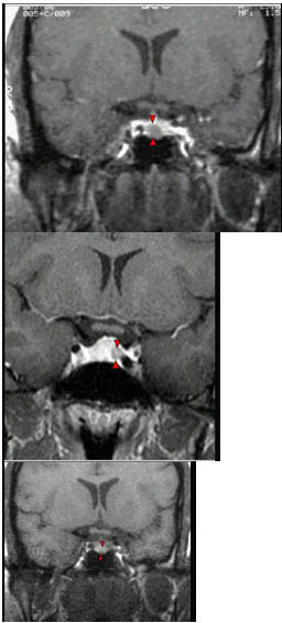 18、单项选择题 患者男,39岁,因“反复头痛伴视力下降1年加重10d”来诊。近1年来常有头痛,性欲下降,逐渐出现阳痿等症状。实验室检查:血清PRL>1000ng/ml(正常值1.90~25.00ng/ml),TT30.48nmol/L(正常值0.89~2.44nmol/L),TT441.43nmol/L(正常值62.68~150.80nmol/L),TSH1.173μU/ml(正常值0.500~4.940μU/ml),GH0.003ng/ml(正常值0~10ng/ml)。血浆皮质醇<10ng/ml(8AM)。睾酮水平0.56ng/ml(成年男性正常值3.5~8.6ng/ml),鞍区MRI:31mm×19mm×16mm占位,包裹左侧海绵窦2/3以上。 首选处理措施是()。