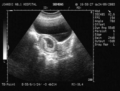 患者,女性,转移性右下腹疼痛4小时,超声见一长条低回光团,边界不清,如图所示,考虑为()