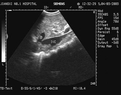 某患者肝脏及下腔静脉肝段内见异常回声。声像图表现如图,诊断为()